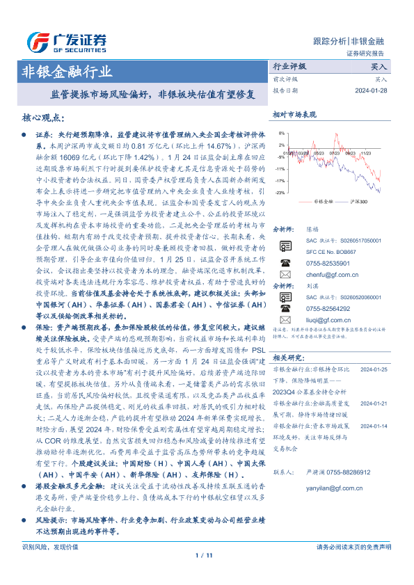 【广发证券】【20240128】非银金融行业:监管提振市场风险偏好,非银板块估值有望修复-11页