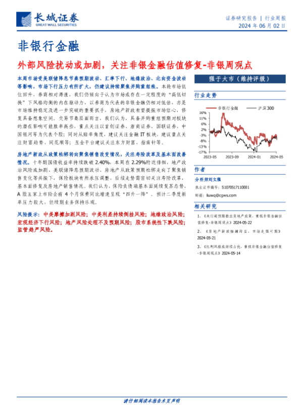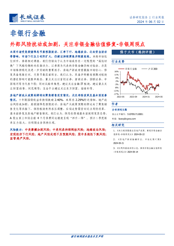 【长城证券】【20240602】非银行业周观点:外部风险扰动或加剧,关注非银金融估值修复-29页