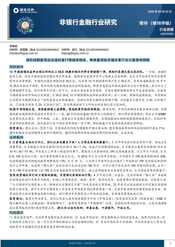 【国金证券】【20240603】非银金融行业周报:保险短期震荡后估值修复行情或将继续,券商重视投资端改革行动方案落地预期-11页