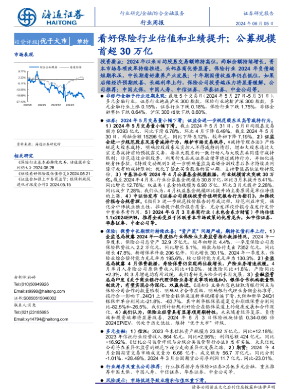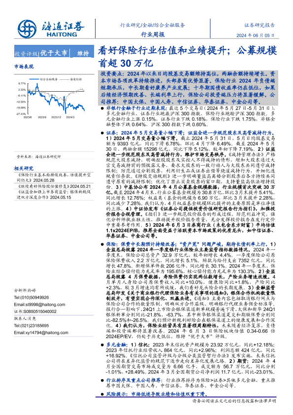 【海通证券】【20240605】金融行业周报:看好保险行业估值和业绩提升;公募规模首超30万亿-12页