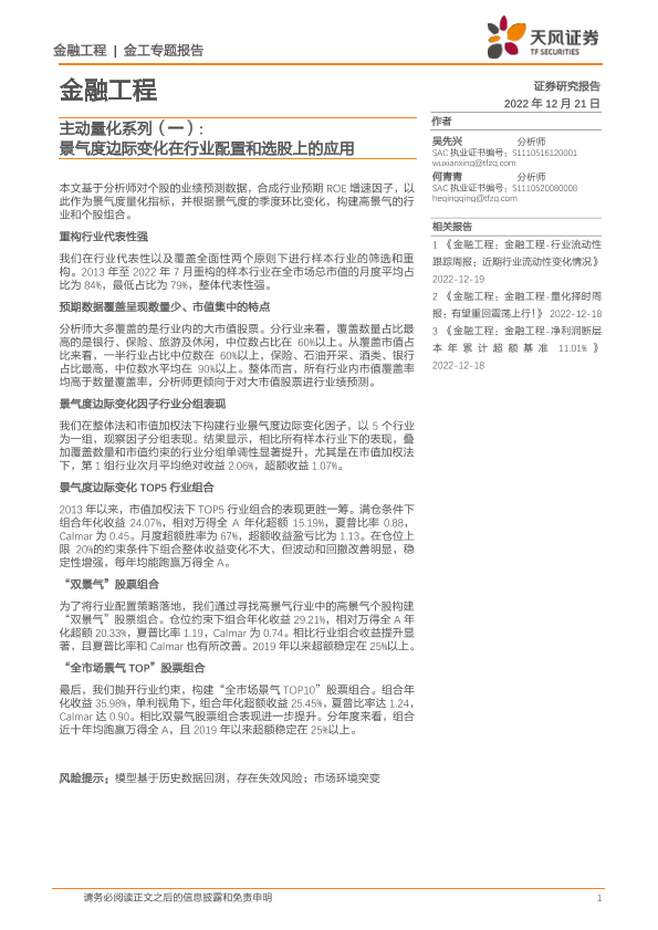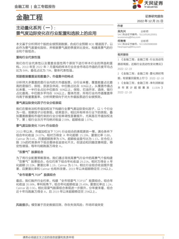 【天风证券】【20221221】主动量化系列(一):景气度边际变化在行业配置和选股上的应用-21页