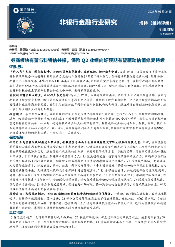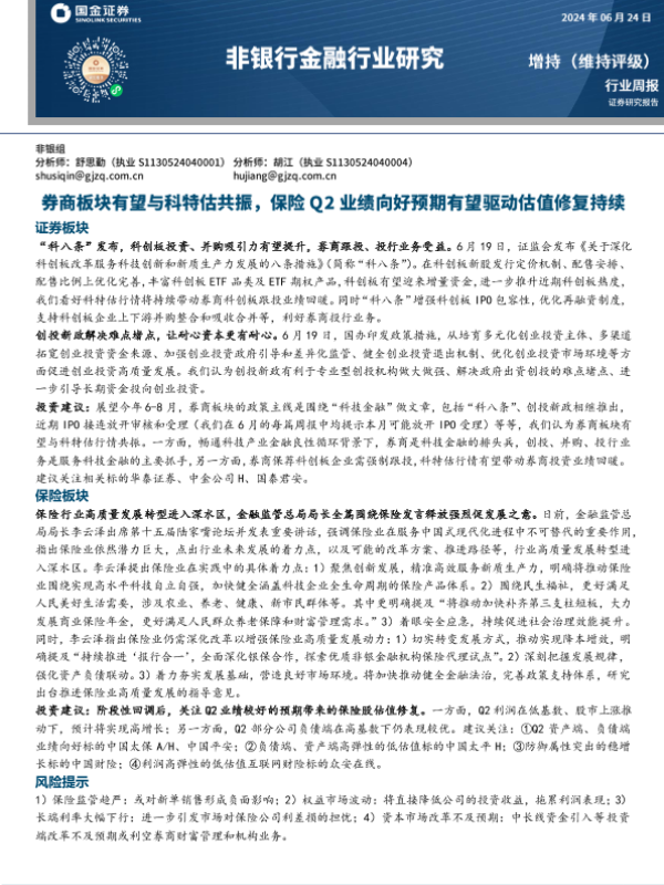 【国金证券】【20240624】非银行金融行业研究周报:券商板块有望与科特估共振,保险Q2业绩向好预期有望驱动估值修复持续-11页