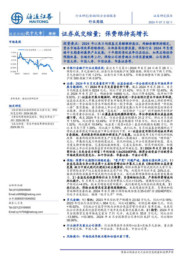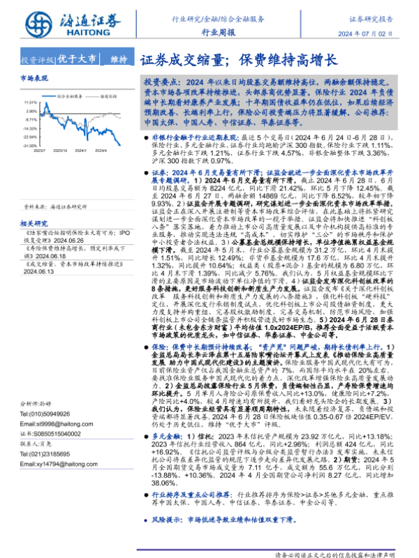 【海通证券】【20240702】综合金融服务行业周报:证券成交缩量;保费维持高增长-12页