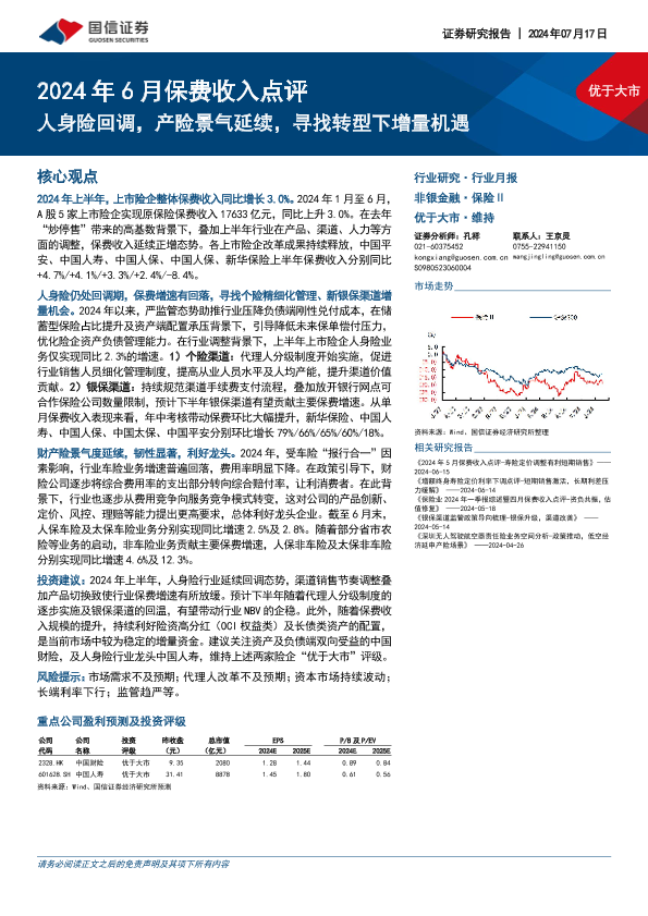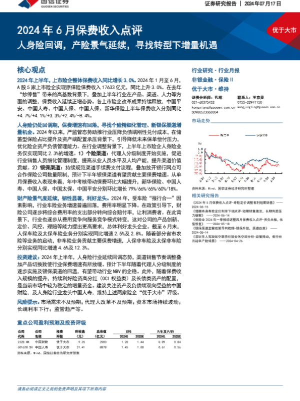【国信证券】【20240717】2024年6月保费收入点评:人身险回调,产险景气延续,寻找转型下增量机遇-10页