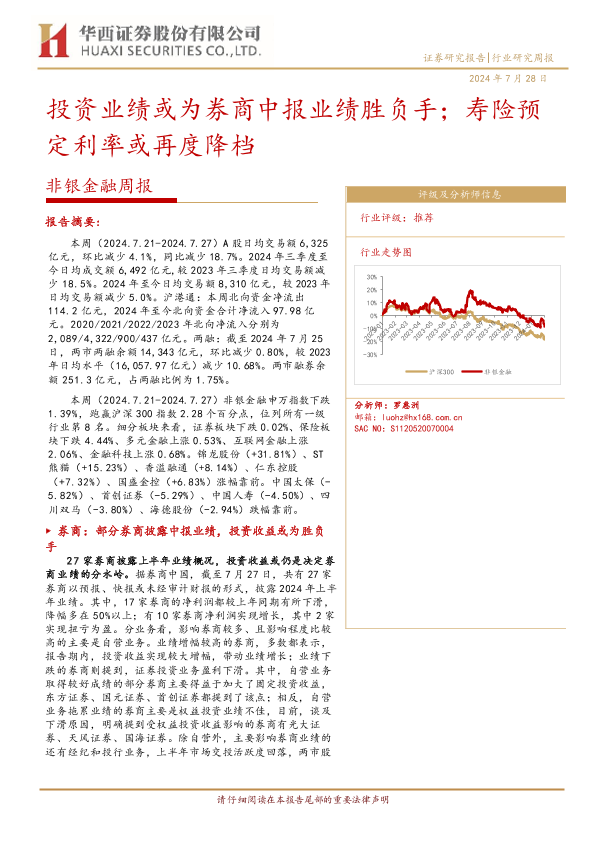 【华西证券】【20240728】非银金融行业周报:投资业绩或为券商中报业绩胜负手;寿险预定利率或再度降档-15页