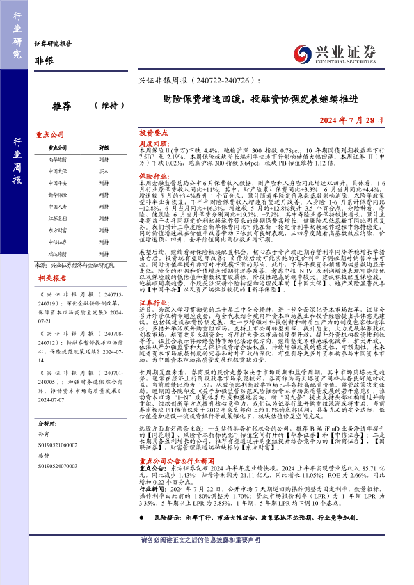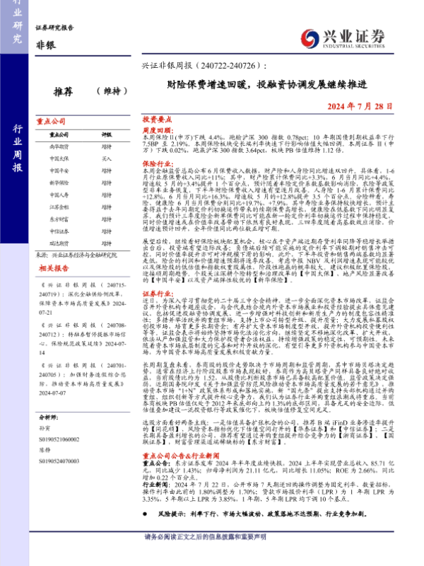 【兴业证券】【20240728】财险保费增速回暖,投融资协调发展继续推进-15页