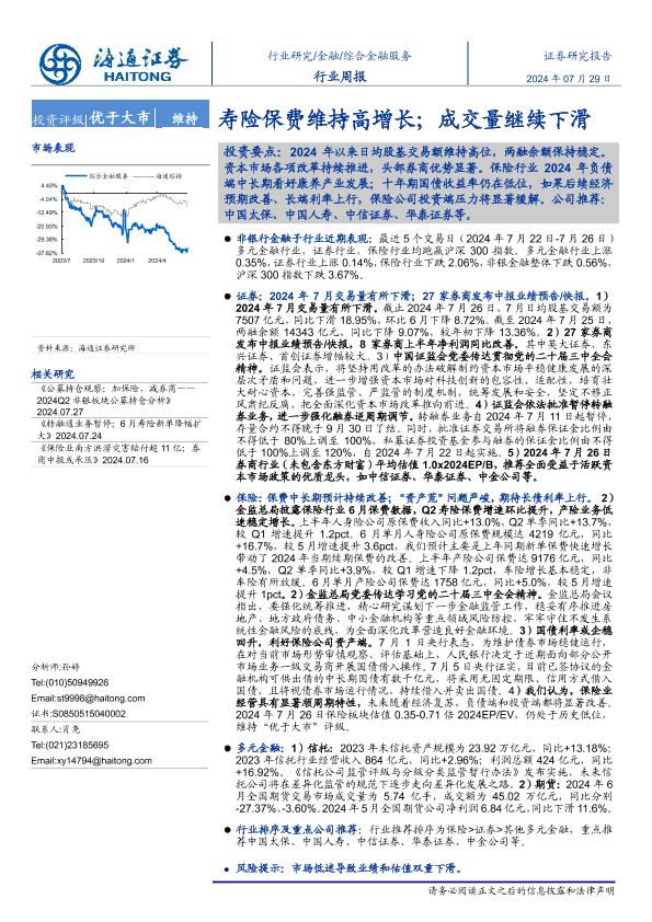 【海通证券】【20240729】综合金融服务行业周报:寿险保费维持高增长;成交量继续下滑-12页