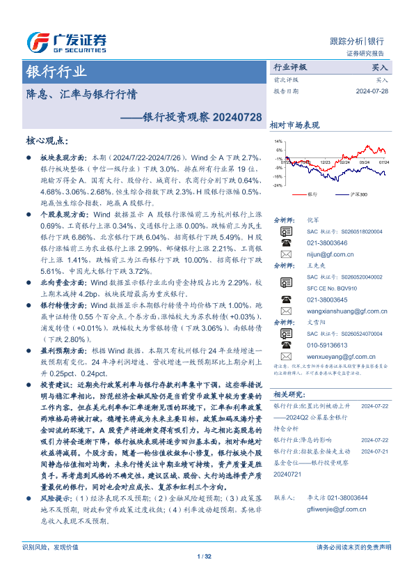 【广发证券】【20240728】银行投资观察:降息、汇率与银行行情-32页