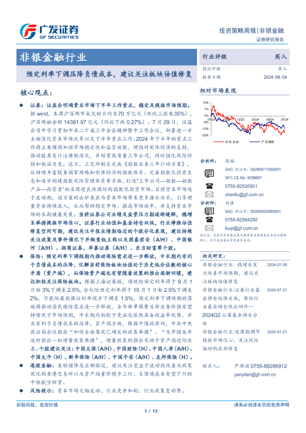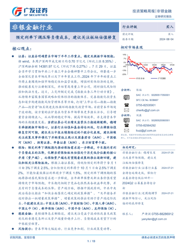 【广发证券】【20240804】非银金融行业投资策略周报:预定利率下调压降负债成本,建议关注板块估值修复-13页