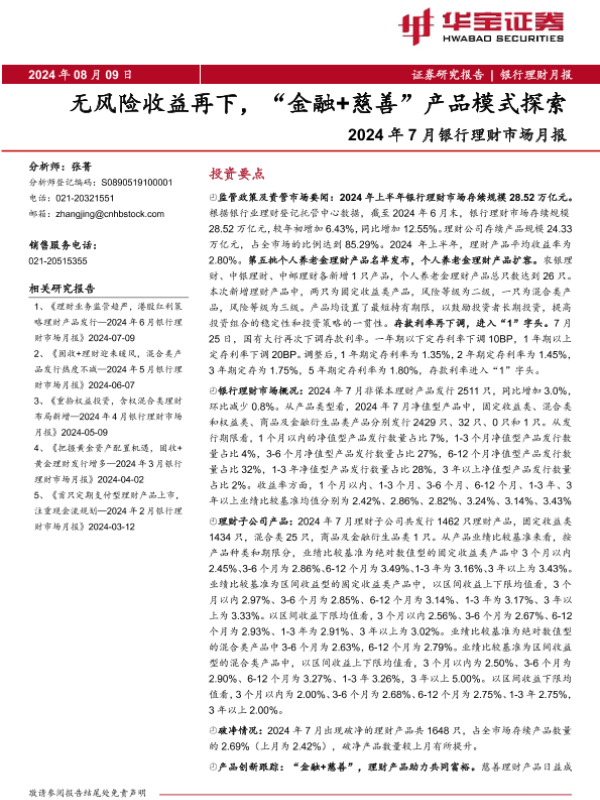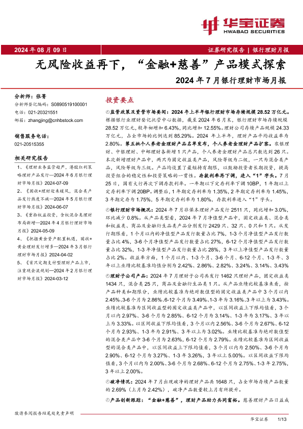 【华宝证券】【20240809】2024年7月银行理财市场月报:风险收益再下,“金融+慈善”产品模式探索-13页
