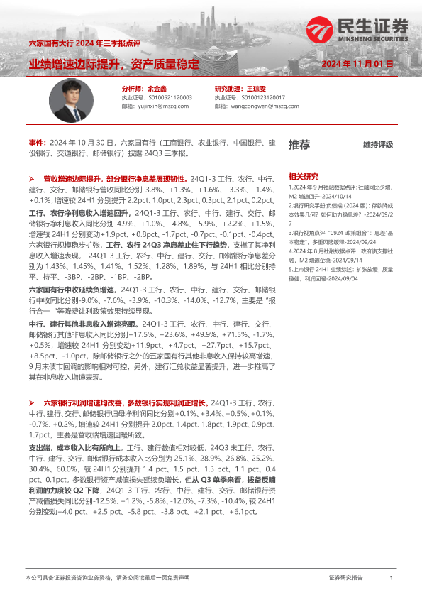 【民生证券】【20241101】六家国有大行2024年三季报点评-15页