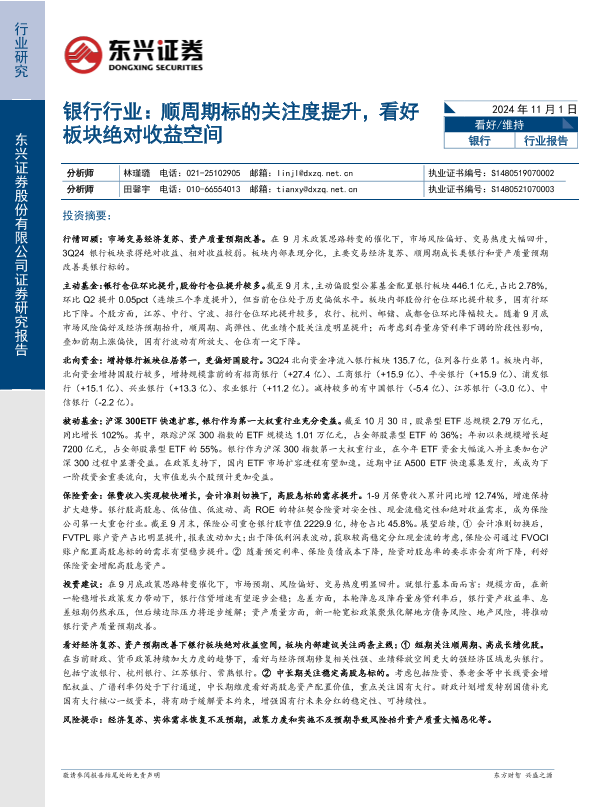 【东兴证券】【20241101】银行行业:顺周期标的关注度提升,看好板块绝对收益空间-15页