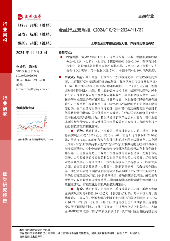 【东莞证券】【20241103】金融行业双周报:上市险企三季报超预期大增,券商自营表现亮眼-14页