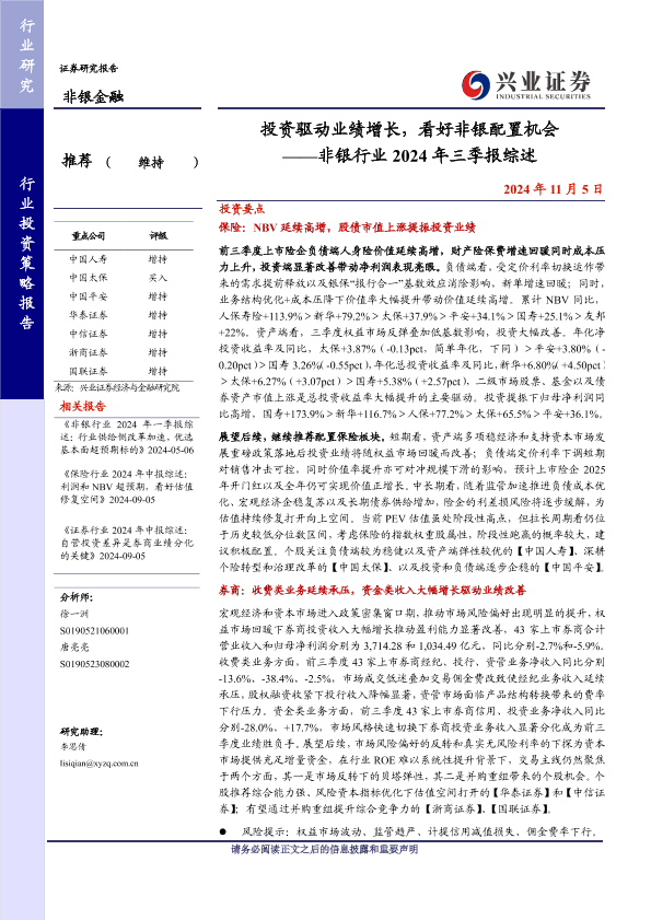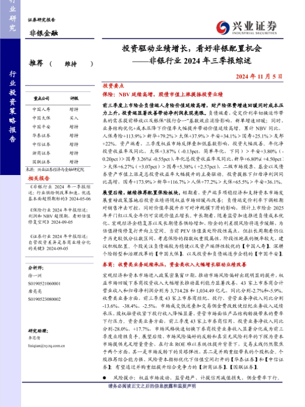 【兴业证券】【20241105】非银行业2024年三季报综述:投资驱动业绩增长,看好非银配置机会-38页