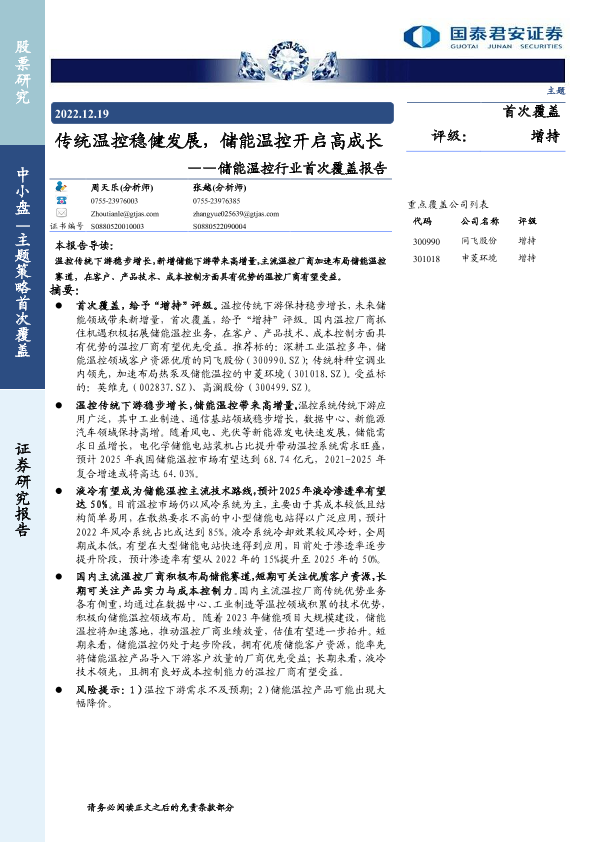 【国泰君安证券】【20221219】储能温控行业首次覆盖报告:传统温控稳健发展,储能温控开启高成长-28页