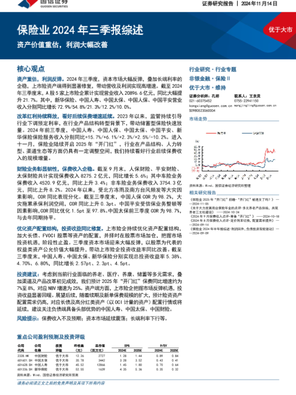 三季报 保险业 利润改善 资产价值重估 资本市场