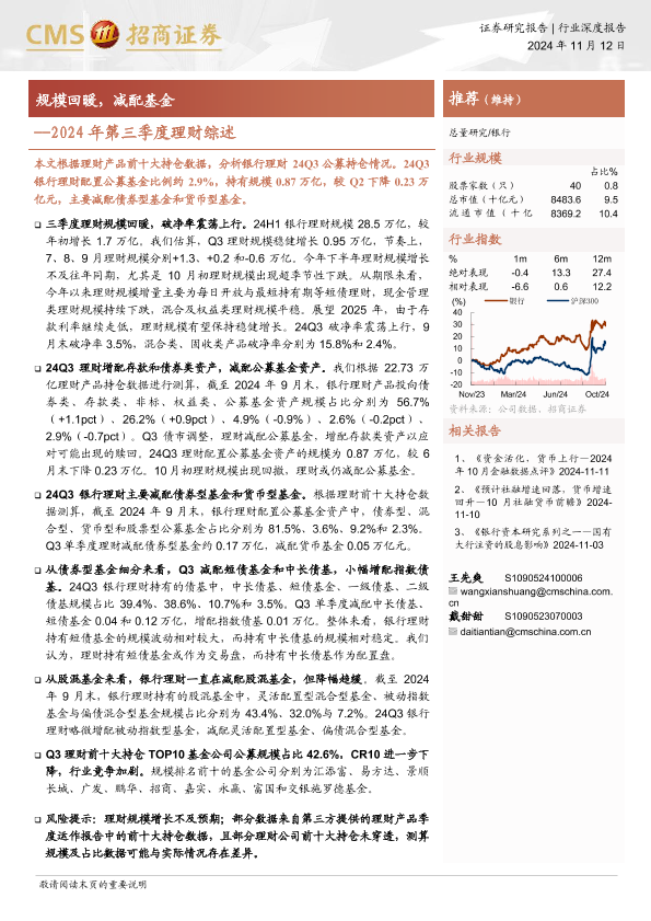 2024年第三季度 公募基金 资产配置 金融行业 银行理财