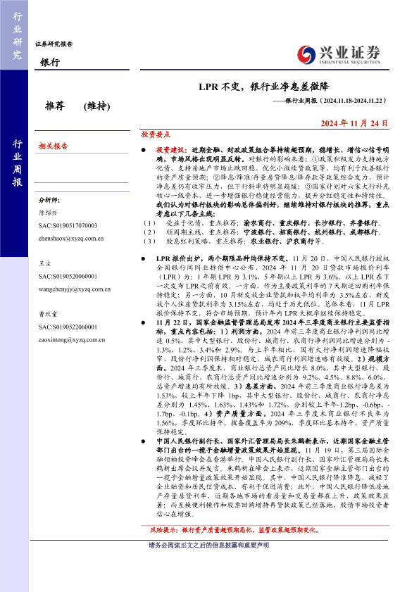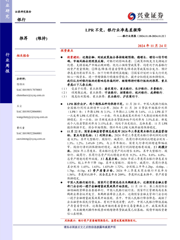 【兴业证券】【20241124】LPR不变,银行业净息差微降-15页