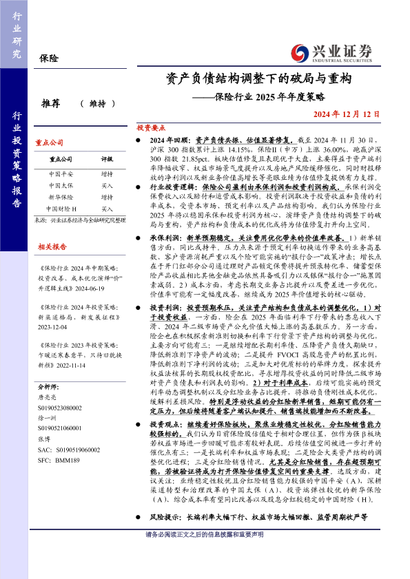 【兴业证券】【20241212】保险行业2025年年度策略:资产负债结构调整下的破局与重构-30页