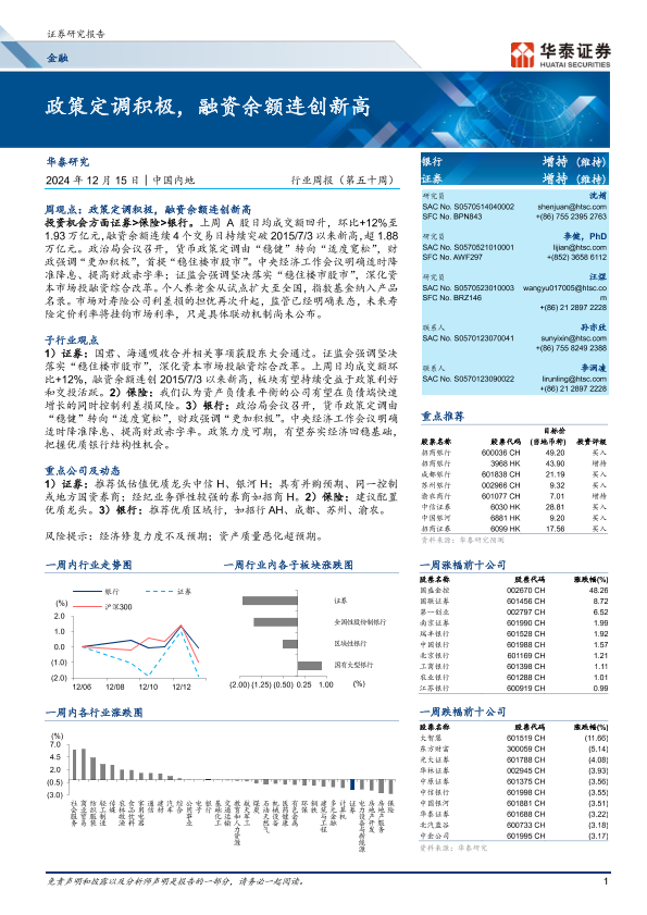 【华泰证券】【20241215】金融行业周报:政策定调积极,融资余额连创新高-26页