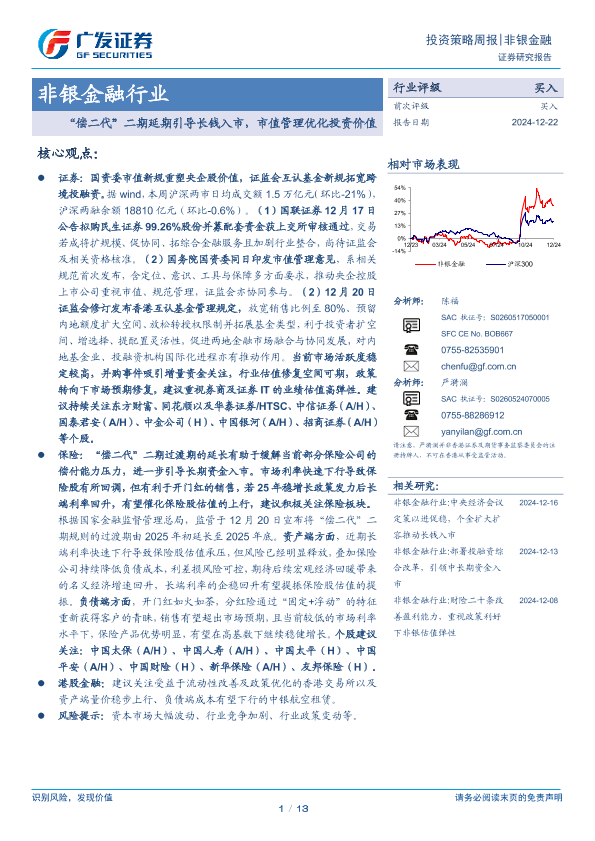【广发证券】【20241222】非银金融行业投资策略周报:“偿二代”二期延期引导长钱入市,市值管理优化投资价值-13页