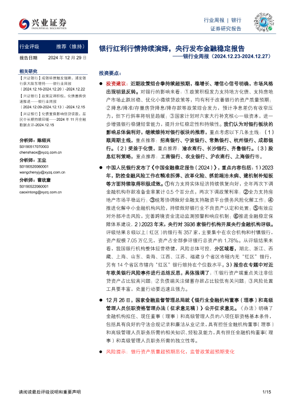 【兴业证券】【20241229】银行业周报:银行红利行情持续演绎,央行发布金融稳定报告-15页