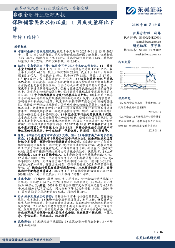 【东吴证券】【20250119】非银金融行业跟踪周报:保险储蓄类需求仍旺盛;1月成交量环比下降-16页