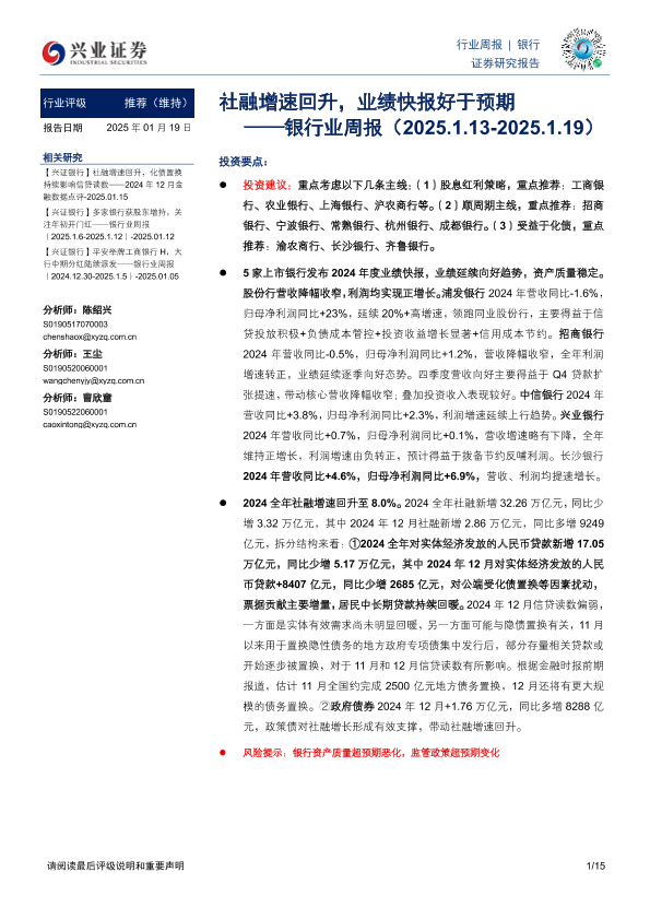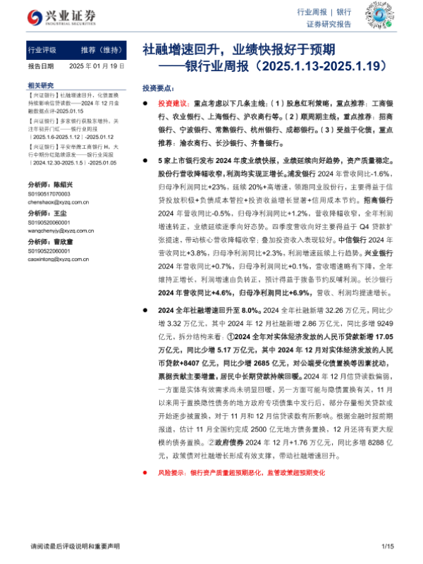 【兴业证券】【20250119】社融增速回升,业绩快报好于预期-15页