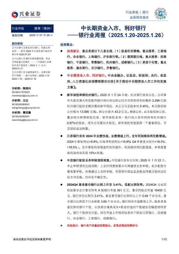 【兴业证券】【20250126】中长期资金入市,利好银行-15页