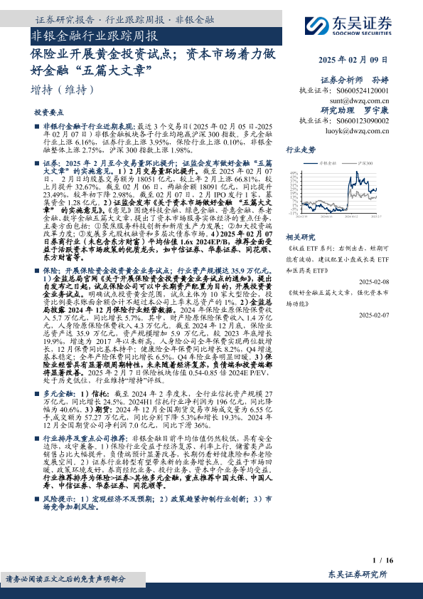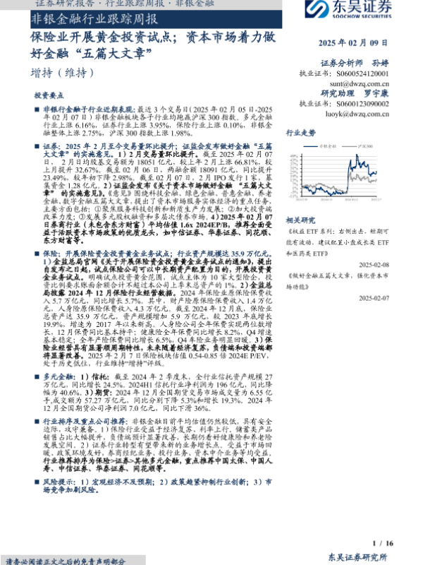 【东吴证券】【20250209】非银金融行业跟踪周报:保险业开展黄金投资试点;资本市场着力做好金融“五篇大文章”-16页