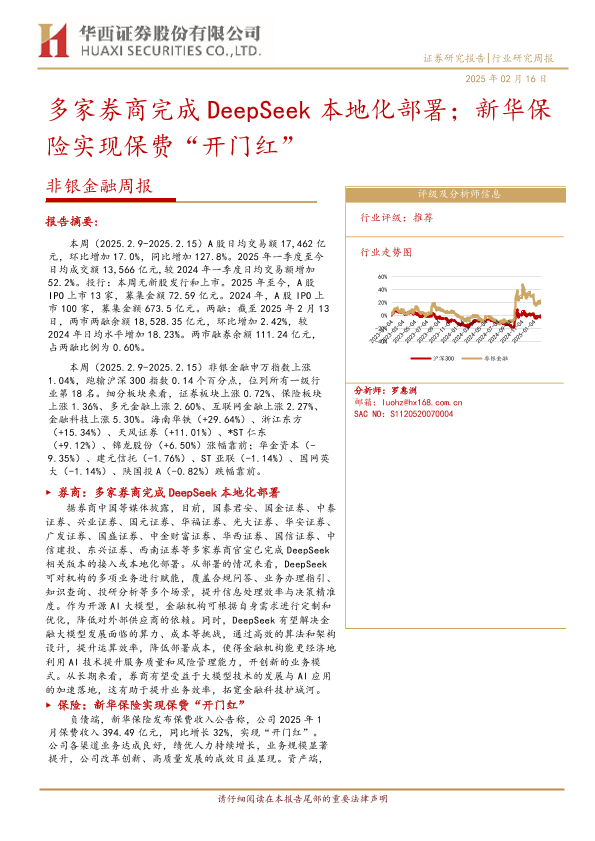 【华西证券】【20250216】非银金融周报:多家券商完成DeepSeek本地化部署;新华保险实现保费“开门红”-11页