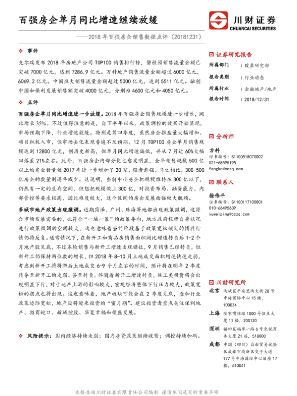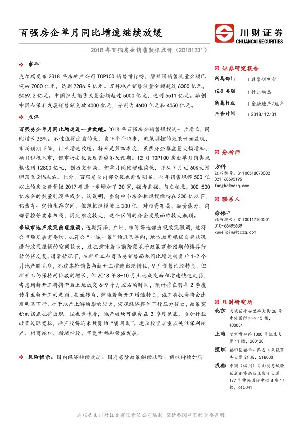【川财证券】【20181231】2018年百强房企销售数据点评:百强房企单月同比增速继续放缓-2页