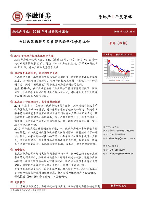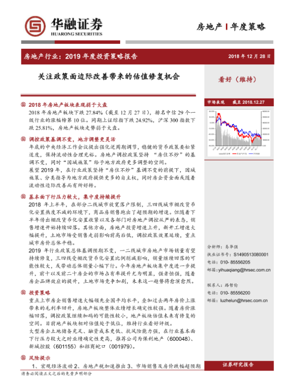【华融证券】【20181228】房地产行业2019年度投资策略报告:关注政策面边际改善带来的估值修复机会-22页