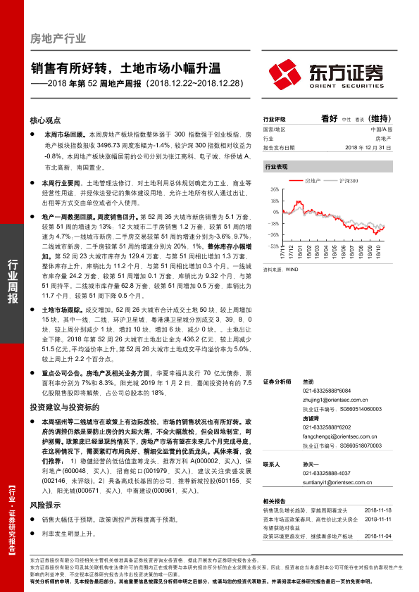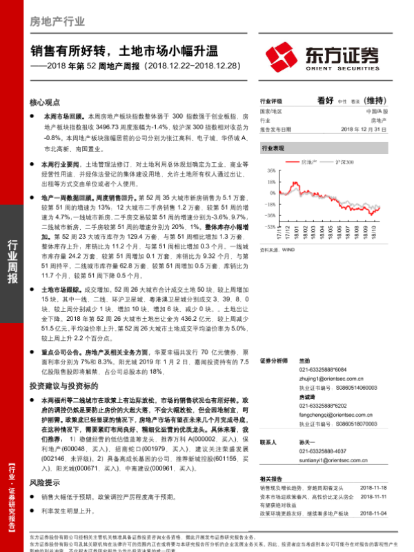 【东方证券】【20181231】2018年第52周地产周报:销售有所好转,土地市场小幅升温-16页
