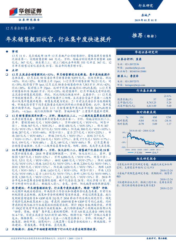 【华创证券】【20190101】12月房企销售点评:年末销售靓丽收官,行业集中度快速提升-11页