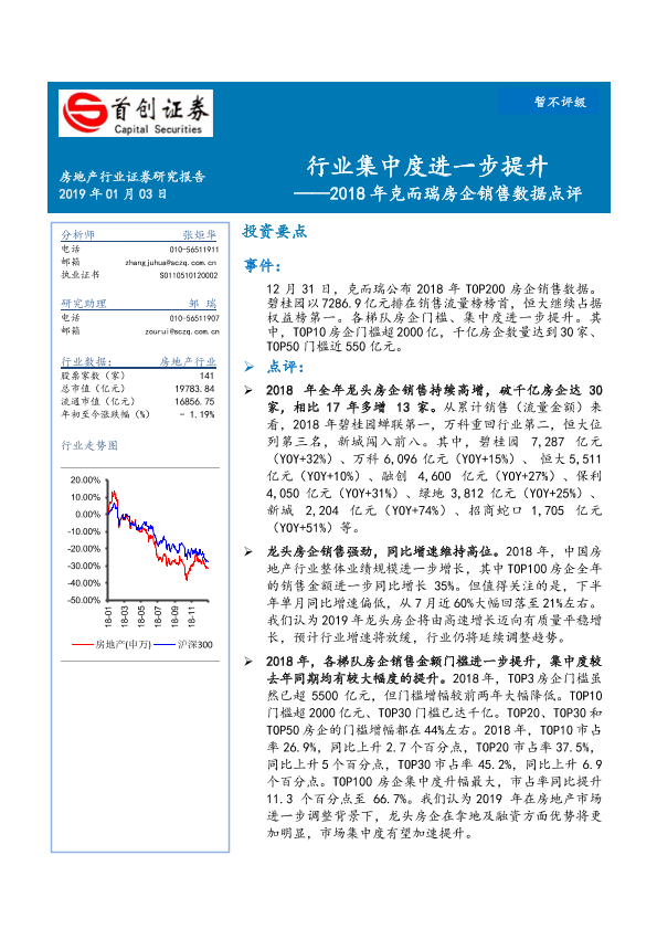 【首创证券】【20190103】2018年克而瑞房企销售数据点评:行业集中度进一步提升-3页