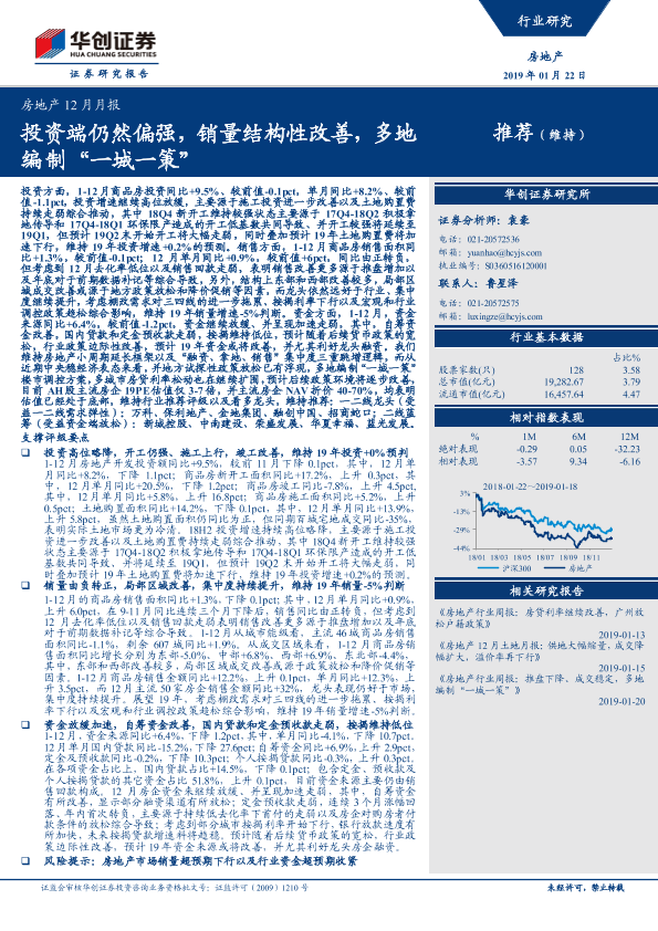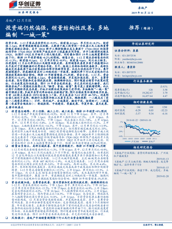 【华创证券】【20190122】房地产12月月报:投资端仍然偏强,销量结构性改善,多地编制“一城一策”-20页