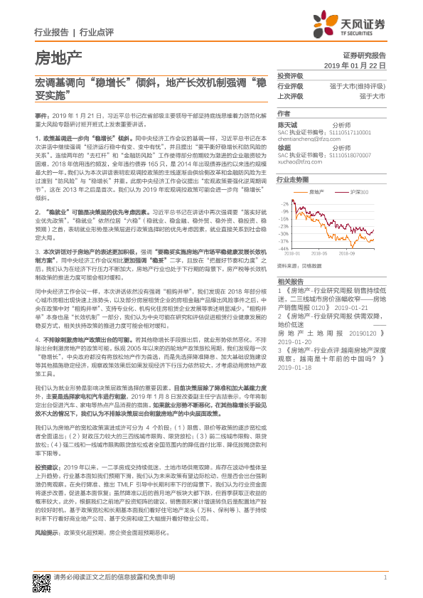 【天风证券】【20190122】房地产行业点评:宏调基调向“稳增长”倾斜,地产长效机制强调“稳妥实施”-4页