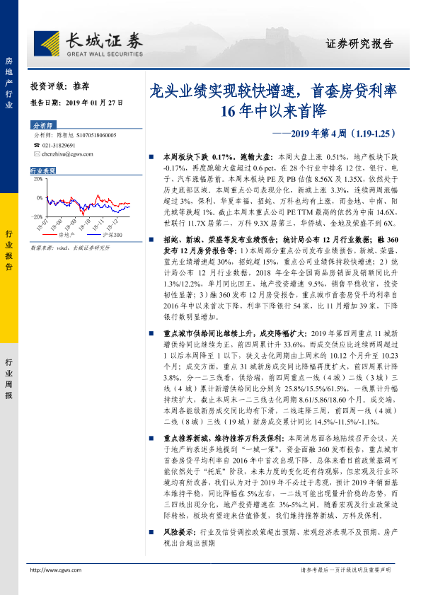 【长城证券】【20190127】房地产2019年第4周:龙头业绩实现较快增速,首套房贷利率16年中以来首降-18页