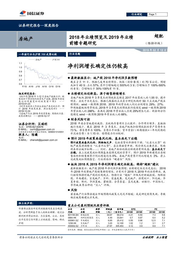 【国信证券】【20190212】房地产行业2018年业绩预览及2019年业绩前瞻专题研究:净利润增长确定性仍较高-18页