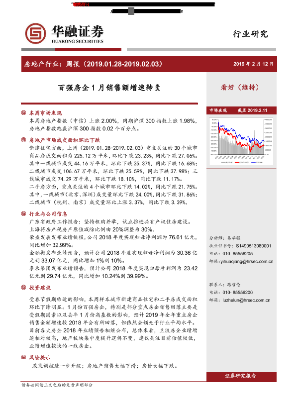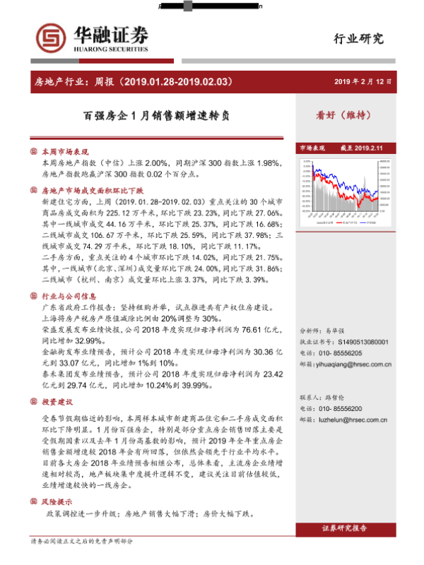 【华融证券】【20190212】房地产行业周报:百强房企1月销售额增速转负-9页