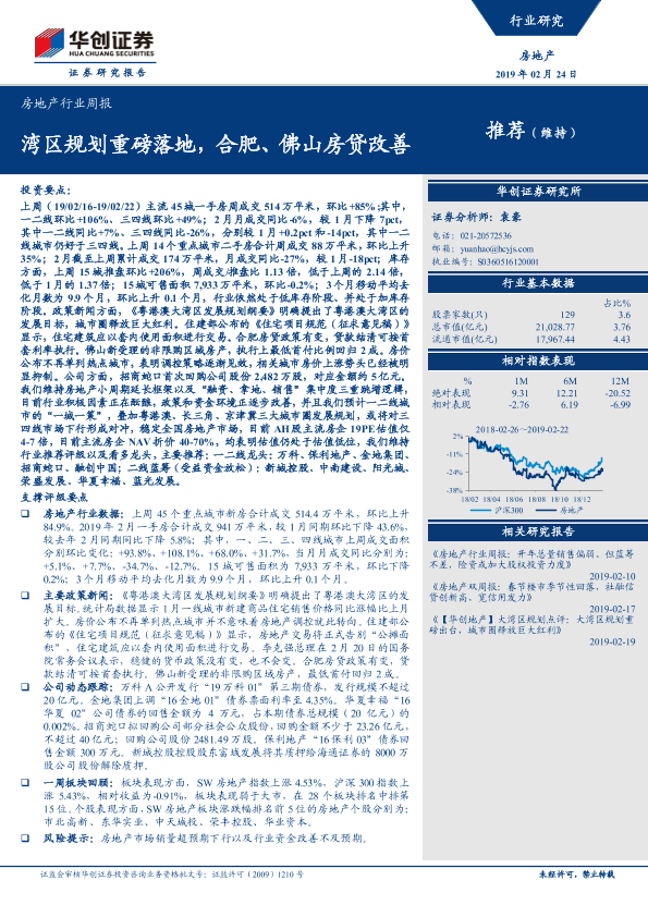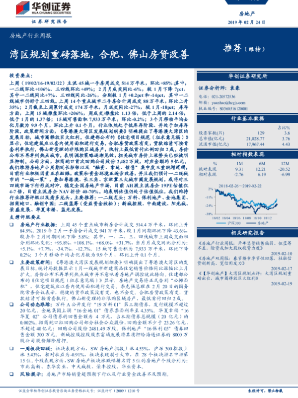 【华创证券】【20190224】房地产行业周报:湾区规划重磅落地,合肥、佛山房贷改善-22页