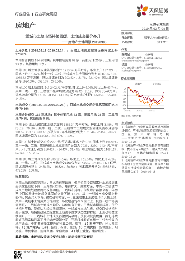 【天风证券】【20190304】一线城市土地市场持续回暖,土地成交量价齐升-10页