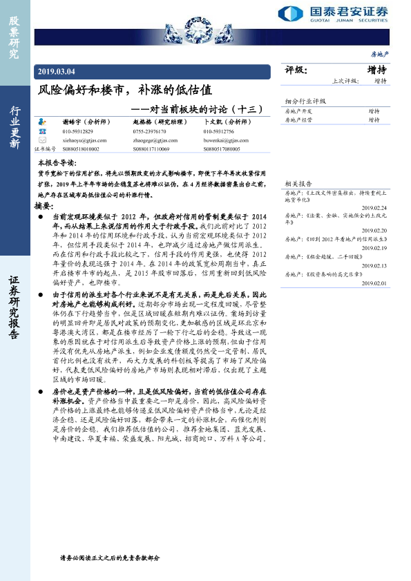 【国泰君安证券】【20190304】对当前板块的讨论(十三)-风险偏好和楼市,补涨的低估值-3页