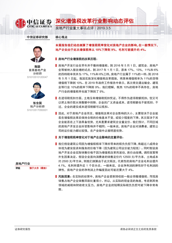 【中信证券】【20190305】房地产行业重大事项点评:深化增值税改革行业影响动态评估-3页