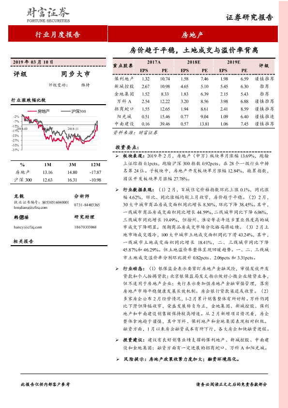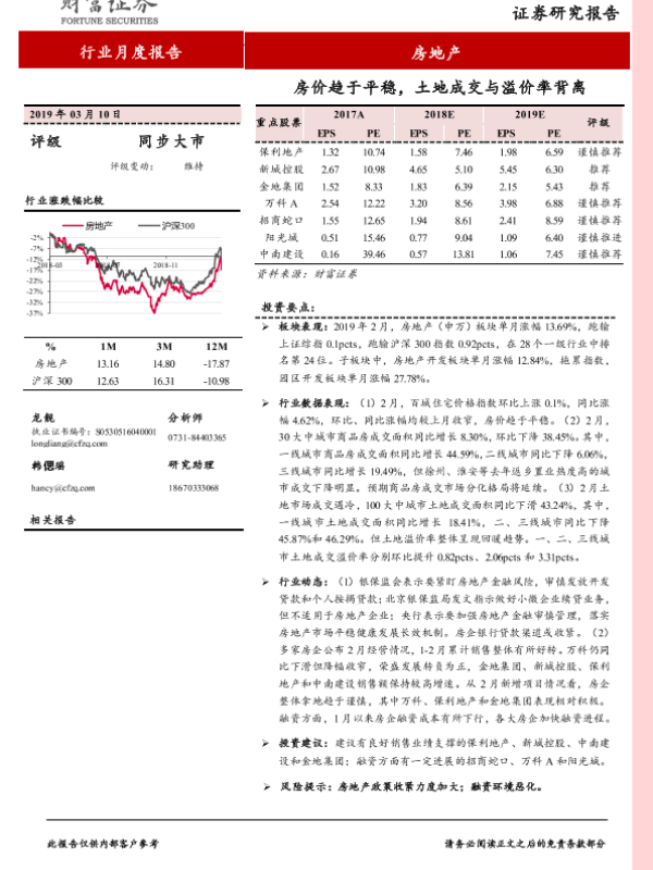 【财信证券】【20190310】房地产行业月度报告:房价趋于平稳,土地成交与溢价率背离-11页