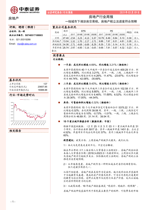 【中泰证券】【20190309】房地产行业周报:一线城市下调涉房交易税,房地产税立法进度符合预期-18页