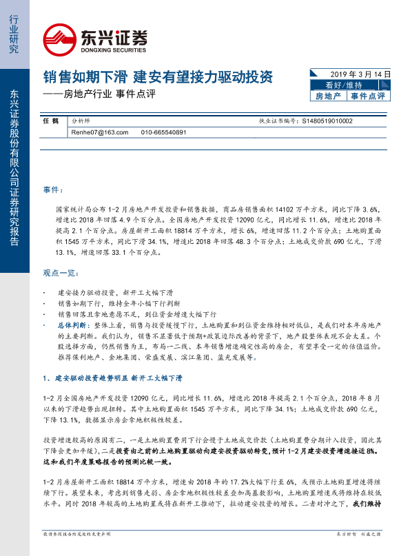 【东兴证券】【20190314】房地产行业事件点评:销售如期下滑 建安有望接力驱动投资-6页