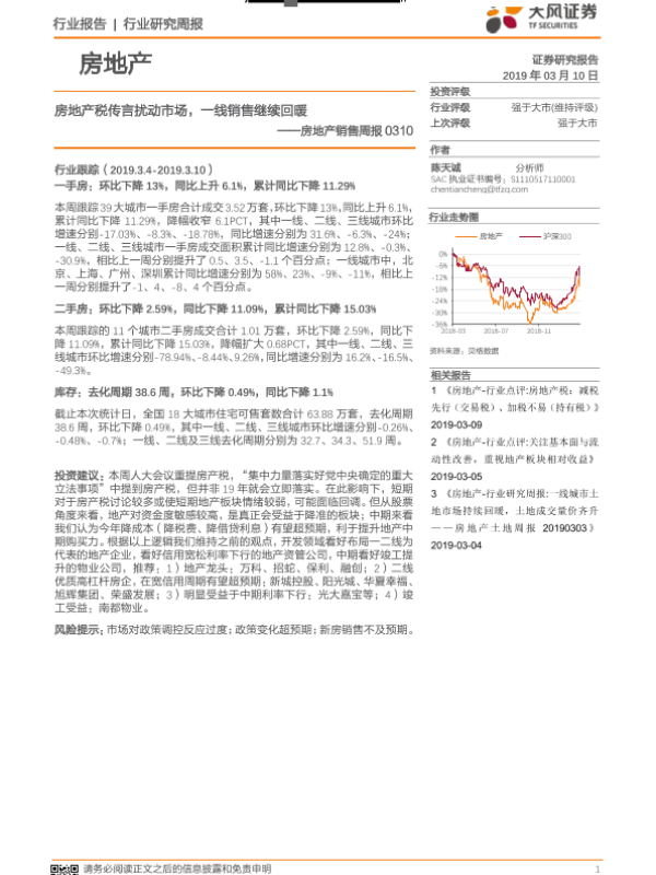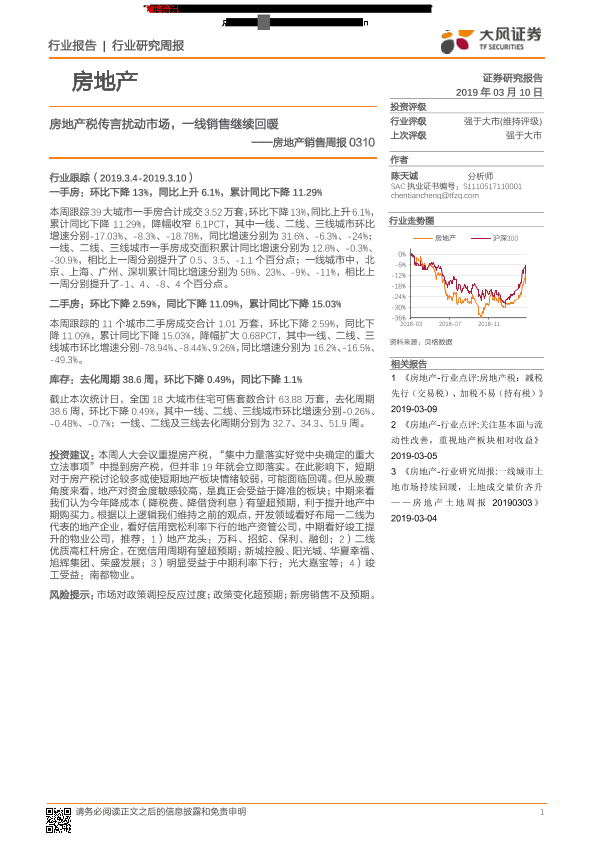 【天风证券】【20190310】房地产销售周报:房地产税传言扰动市场,一线销售继续回暖-15页