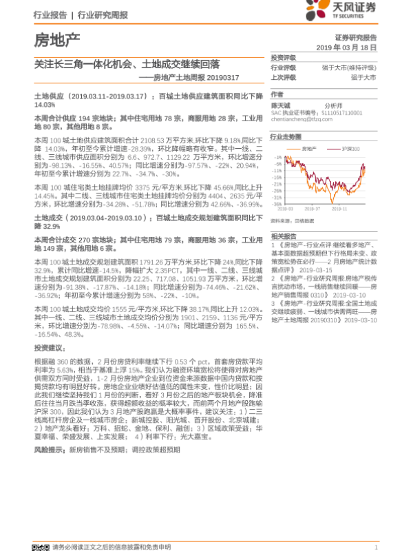 【天风证券】【20190318】关注长三角一体化机会、土地成交继续回落-9页